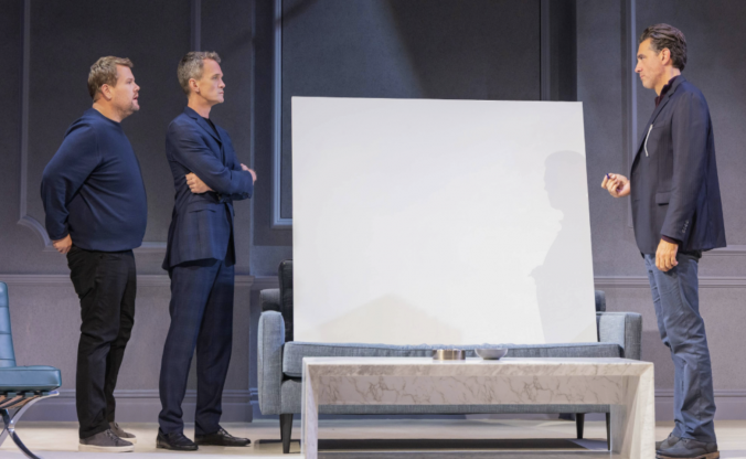 Sophisticated, worldly Serge (Harris) has purchased a painting that’s completely white, and spent $300,000 on it, waxing lyrical about the artist, the brushstrokes, the colors implicitly visible... Equally worldly Marc (Cannavale), pulling no punches, tells him it’s shit. Yvan (Corden), the not-quite buffoon/comicrelief/loser buddy plays Serge and Marc against each other, tells them what they want to hear, and before it all comes crashing down, has a long monologue that just displays how much of a doormat he is, to his fiancée, his mother – and his friends. Comedy leavens the show, but the underlying nastiness of these men’s relationships with each other is kind of hard to take.