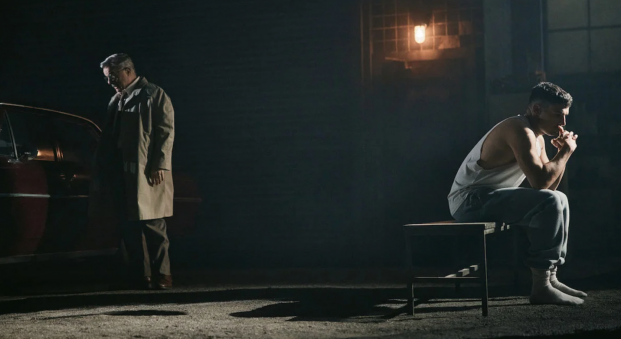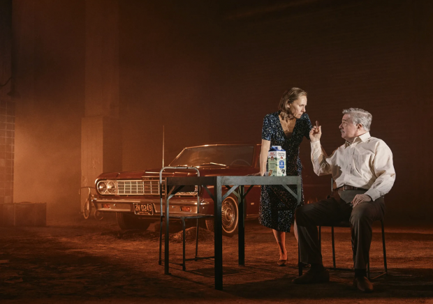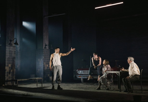 We’ve all admired stage productions of this great tragedy over the years, featuring Lee J. Cobb (the original Willy), George C. Scott, Dustin Hoffman, Brian Dennehy, Philip Seymour Hoffman, and most recently Wendell Pierce in the title role. Several factors give this current revival an unforgettable power. Mantello’s staging on Chloe Lamford’s bare, shadowy set features a huge red Chevrolet that rolls in at the top of the show, behind which a garage door slams shut as the action begins. Faintly illuminated by a giant upstage window (lighting by Jack Knowles), you get the sense of “the inside of Willy’s head,” as scenes in the present are interrupted by flashbacks to a time when his sons were young and full of promise (especially Biff, as a football star). As Willy’s tragic descent accelerates, flashbacks also include lost opportunities (offered by his successful, almost mythic brother Ben, played by a larger-than-life Jonathan Cake). The most devastating flashback dramatizes the discovery made by Biff that Willy, the father he admired and adored, was having an affair with a secretary from one of the Boston offices where Willy was selling his wares, gifting her with stockings while Linda wore ones with holes.
