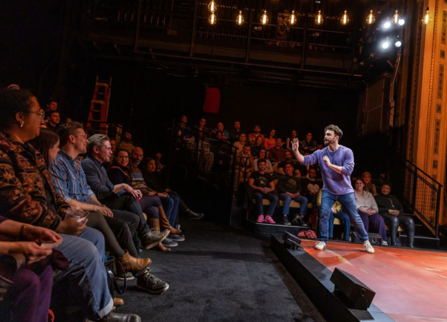 Daniel Radcliffe’s performance is electric, captivating, playful, and at times almost too real. In the opening moments, I caught myself wondering, “Is this autobiographical?” a credit to the beautifully delivered first monologue. The play hinges on pacing, listening, and instinct, with each performance reshaped in real time as Radcliffe interacts with audience members portraying everyone from his father to his grief counselor and even his spouse. By the end of the show, I found myself wanting to return, if only to see how he responds to a new set of scene partners, a testament to the production’s remarkable re–watch–ability, fueled by its improvisational nature.