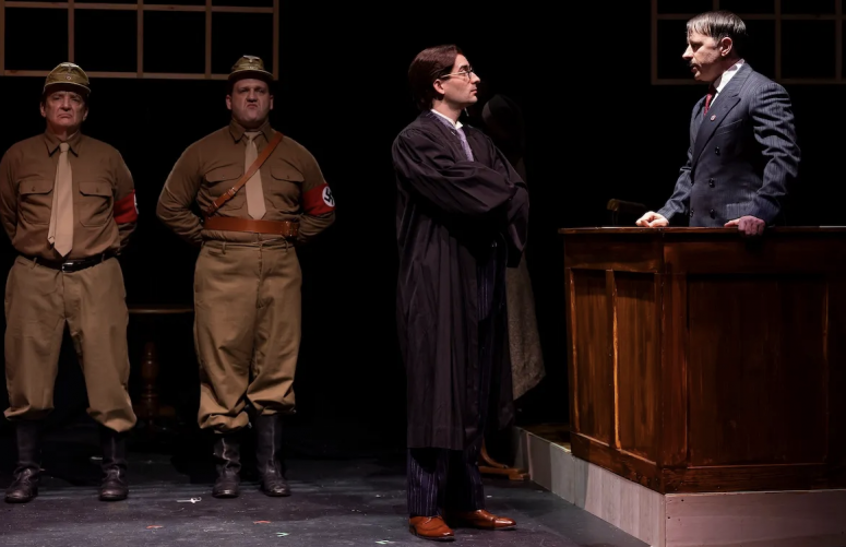 The play moves from Litten’s family home in Königsberg to his law office, where he represents workers and communists assailed by the state. Litten is not an ideologue, left or right. He is devoted to the rule of law, though the newspapers dub him “that Commie-loving Jew Litten.” Initially, Litten insists Germans are too educated and devoted to order to support a maniac like Hitler (Zack Calhoon). But as democratic norms are destroyed, Jews and immigrants attacked, and political enemies targeted, Litten’s law partner (Dave Stishan) warns him of impending doom.