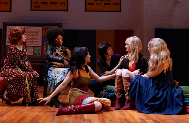 Broadway’s Liberation, now at the James Earl Jones Theater, is blessed with an extraordinary ensemble cast. Six women, representing the variety of women’s experiences, tell their stories at a 1970 consciousness-raising group. It’s set in a Ohio recreation center, where all the banners proclaim boys’ sports: wresting, basketball, etc. The girls are invisible.