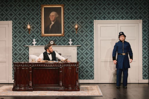 Beyond its crackerjack acting, the creative team do a terrific job at bringing you back to the Civil War days. The theater design collective dots provides the authentic-looking 19th century set, replete with an expansive presidential desk and an imposing portrait of George Washington, hung on the back wall. An olive-colored sofa and chairs add a bit of warmth to the Oval Office, as does the rectangular rug positioned at center stage.