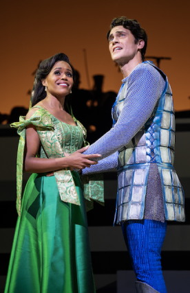 That’s not to say that the rest of the cast didn’t shine. They did. In fact, Urie, as the coming-of-age Prince Dauntless, was just right as the son who’s been under his mother’s thumb since his royal birth. Kelly was terrific as King Sextimus the Silent (He’s unable to speak due to an unfortunate curse), as was Harriet Harris, playing his terror-of-a-wife Queen Aggravain. Jackson and Daniels were pitch-perfect as Sir Harry and Lady Larken, whose incipient parenthood creates a lot of drama in the world of this musical. And a special shout out to Francis Jue who played his Wizard with delicious villainy.
