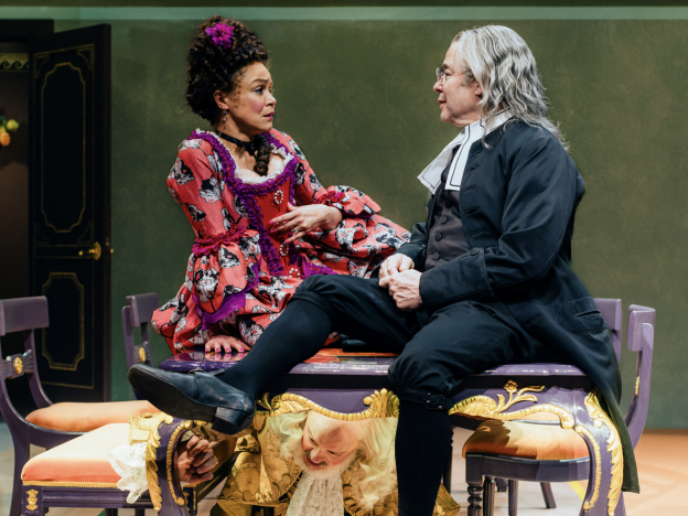 Written in rhyming couplets, the humorous lines land — “open mind or a lack of spine” — thanks to a strong ensemble cast: Amber Gray as Elmire, Orgon’s long-suffering wife, Francis Jue his brother-in-law, Bianca Del Rio, the haughty mother, Lisa Kron as maid, Emily Davis as the daughter, Ryan J. Haddad as the ignored son and Ikechukwu Ufomadu as Valère, who hopes to marry the daughter of the house.