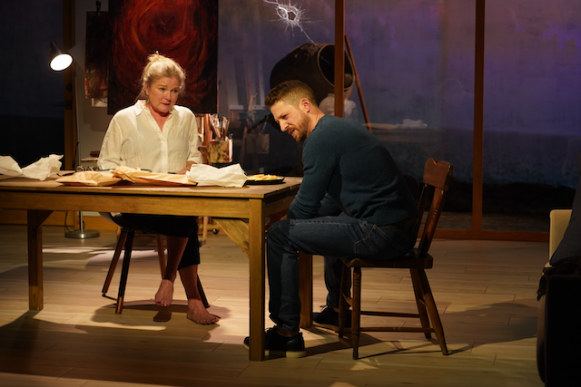 All the action takes place on Colm McNally’s minimalist set. We see a spacious living room with contemporary-styled furniture; an easel with a bright abstract painting at center stage; a huge windowpane downstage; and a trompe l’œil seaview that changes with each passing scene.