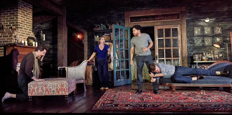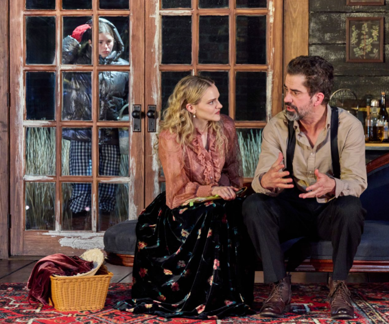 Nor is it a Chekhovian country-house play, no matter the rural family farmhouse setting (superb set by Brett J. Banakis), Ben’s vintage suspenders, Julie’s wildly weird “period” clothing choices (costumes by Jennifer Moeller and Miriam Kelleher). The waving grasses outside the house evoke Russian dacha rather than Hudson Valley farmhouse, though they do set off Cha See’s beautiful lighting design. Not to mention, the surprising absence of phones, laptops, screens of any kind, all through the first act. Ben writes by hand, on paper, in a leather notebook. What century are we even in?