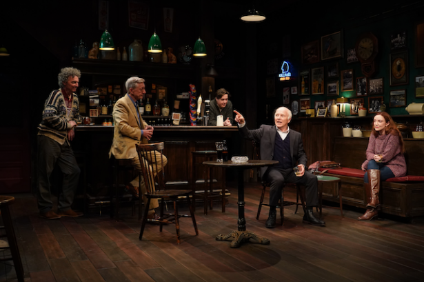 The intimacy of the production, sensitively directed by Ciarán O’Reilly, is its greatest strength. Staged in the homey confines of the Irish Rep’s mainstage, the play’s simplicity and quiet rhythms shine through. Charlie Corcoran’s rustic set, gently lit by Michael Gottlieb, faithfully evokes a rural Irish bar with its wooden counter, well-stocked shelves, bar stools, two small tables, a bench cushioned in red, and photos adorning the walls. One can almost feel the heat from the peat briquette glowing in the fireplace, smell the Guinness flowing freely from bottles (the bar’s taps are on the fritz!), and hear the howling of the wind outside.