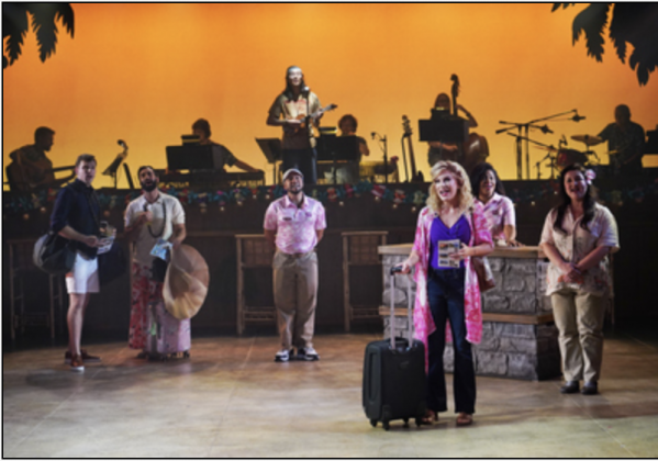 Then we meet Leilani (Cáitlín Burke) and Kaleo (Kelvin Moon Loh), who work at the resort, and have their own issues with Ikaika (Sam Poon), their rebellious son, who wants to play his own music rather than the fake-Island crap forced on them by hotel management. (He has a point; lyrics to “Land of Aloha” include such moments as “Ring of fire as a crown/Azure waters dancing ‘round/Archipelago profound,” etc. and don’t miss the line in another staff song that sings of getting “… Sunburned in your crack.”)