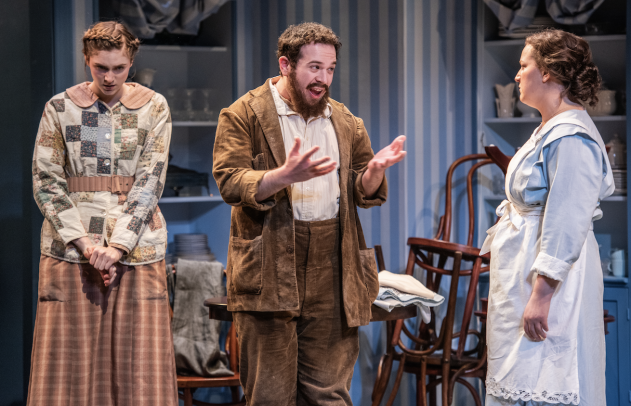 It’s 1915 Lancashire, but there’s little sense of time or place. Can’t anybody up there do an accent? Lines like “I just came in here for a bit of a sit-down” don’t reverberate as they should when delivered in flat Midwestern tones. Brittany Vasta’s unit set is functional and little else, and in what’s supposed to be a prim parlor, why are those tables and chairs stacked atop one another upstage right, and frequently being kicked over or moved about? Kindall Almond’s costumes include a frilly yellow-white number for Jenny whose skirt is too high for 1915, and Zack wanders around town in a brown suit probably too rumpled to pass muster on the streets of Little Hulton. Mary Louise Geiger’s lighting has a nice transitional moment or two, but mostly it’s just very bright.